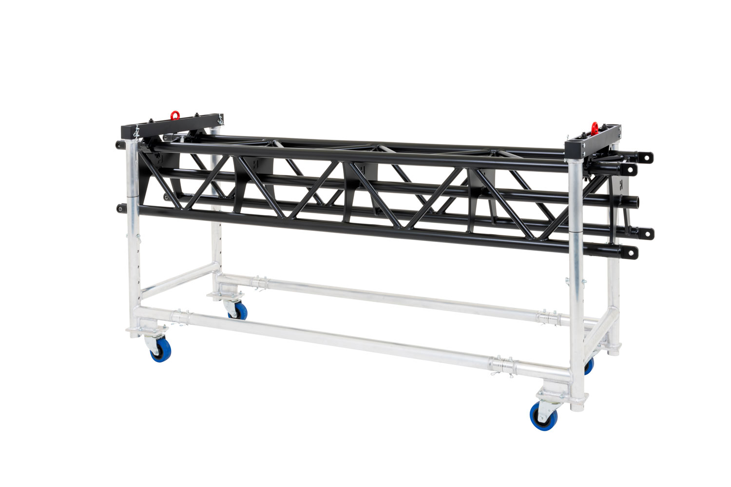 Fits triangular and box trusses up to 40 cm width. Adjustable length, height-adjustable dolly, and lights stay mounted during transport.